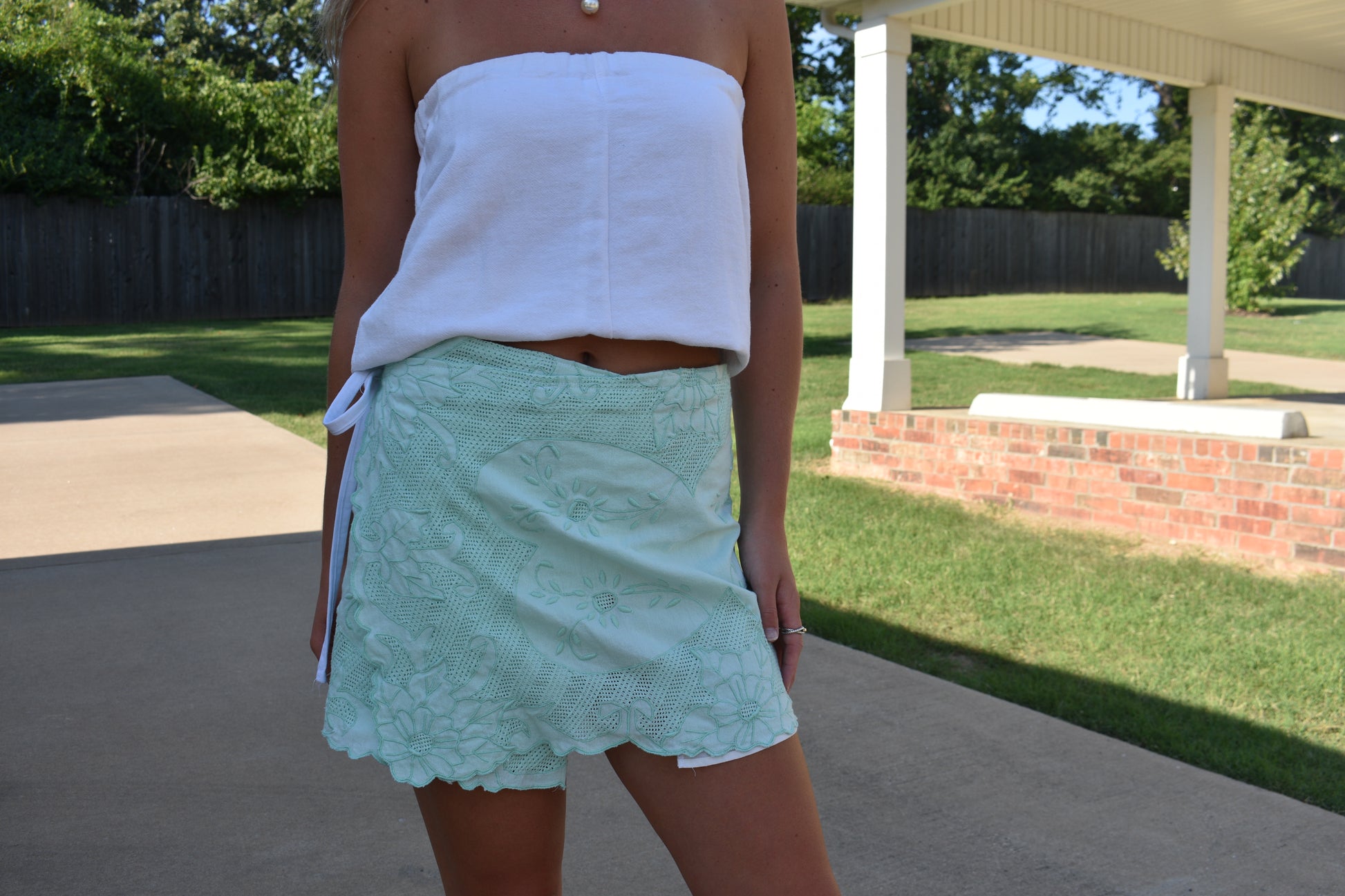 This up-cycled wrap skirt is the perfect addition to your summer wardrobe! Made from vintage linens it fits a size medium best!